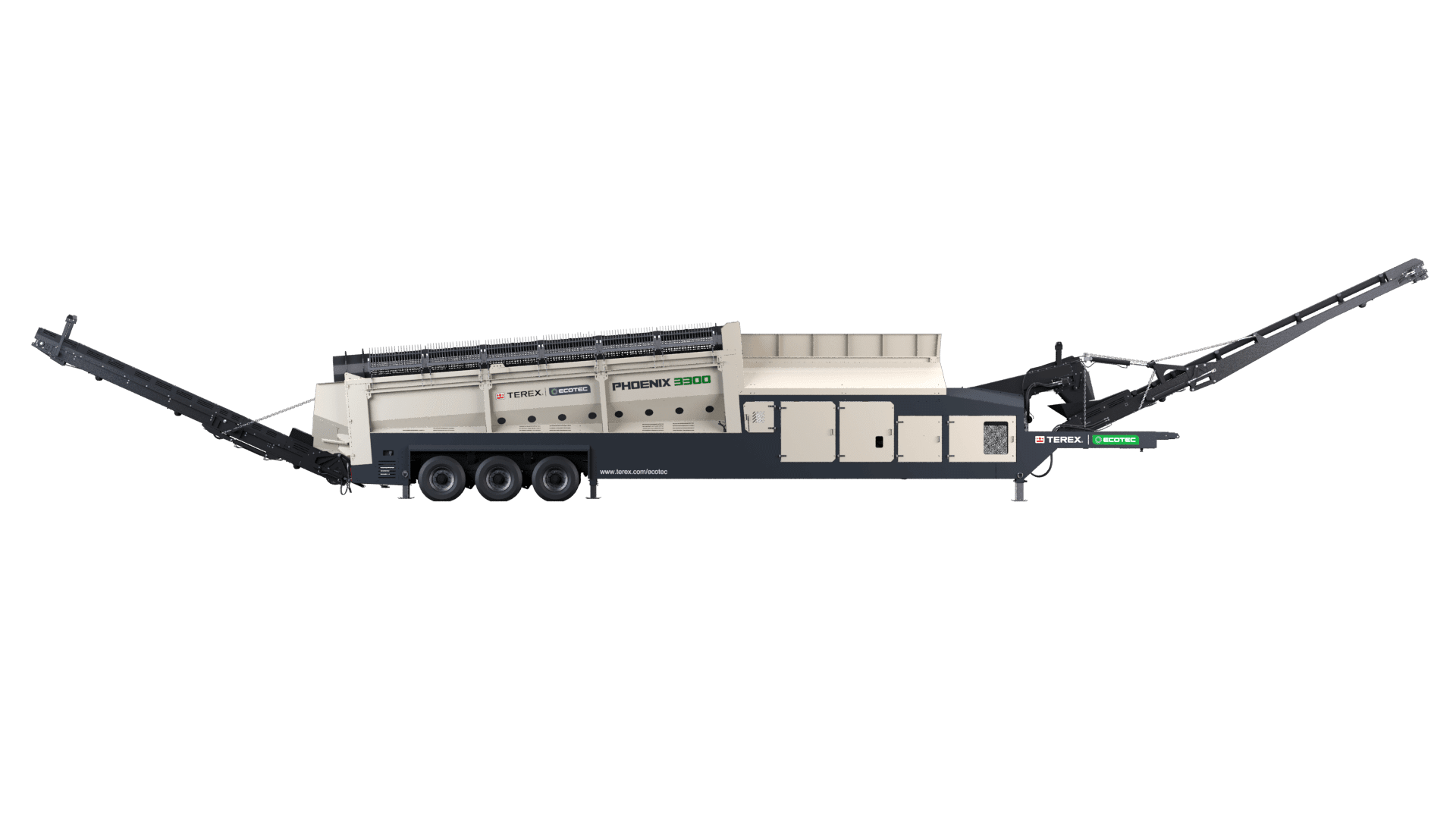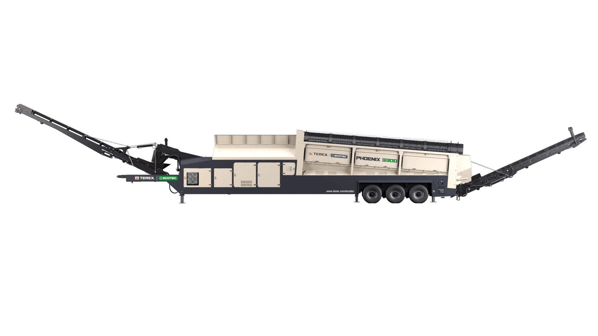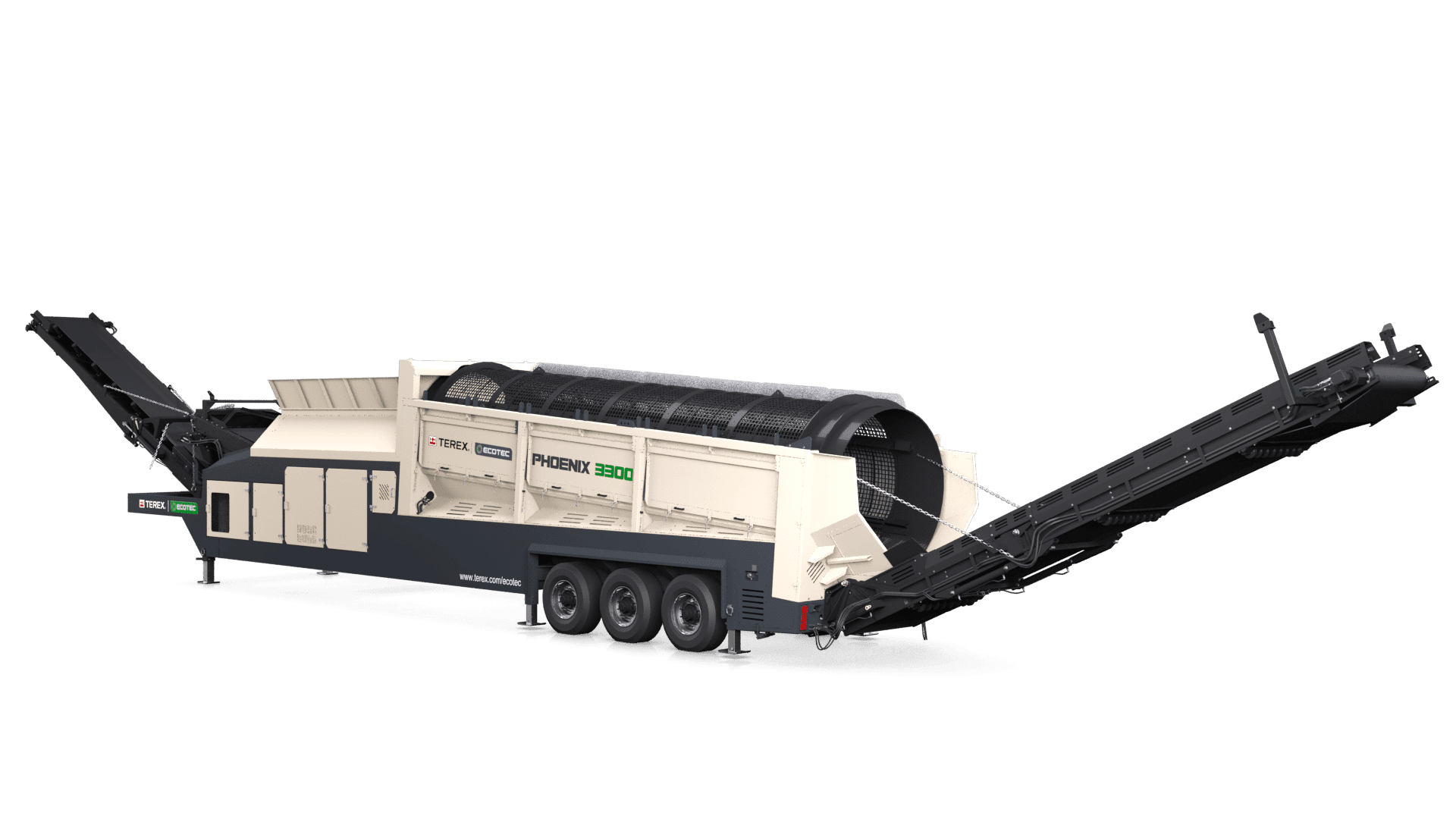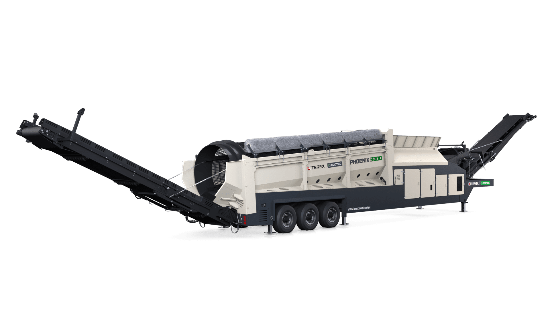 Terex Ecotec’s Phoenix 3300 trommel screen is designed to offer unrivaled production throughput and application flexibility. The robust design with optional features such as a heavy-duty tipping grid or double deck vibrating grid makes the Phoenix 3300 the most versatile trommel on the market today. The machine performs equally well in heavy C&D applications as it does in high volume compost production. The 180° swivel fines conveyor, with a 5.8m (19’) discharge, means the machine can generate massive stockpiles. This swivel feature can be controlled via a radio remote while the machine is in operation, minimizing downtime.